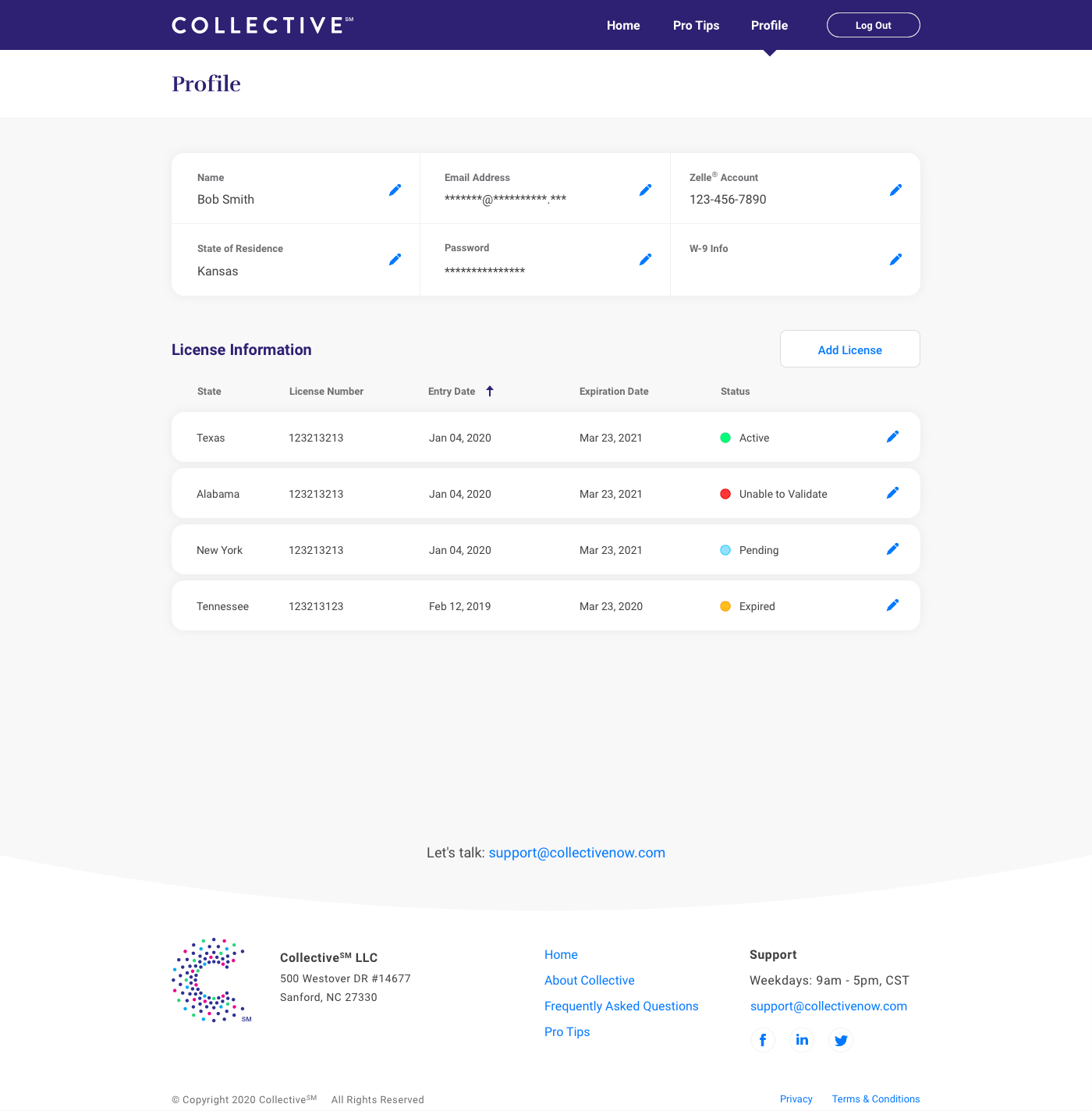 The profile was one of the last additions to Collective. One of the issues we ran into was different states had different licensing requirements, so we created a way for users to upload their license information, that we could then verify on the backend. This prevented having to manually verify and assign different gig workers to each state they were eligible to work in.