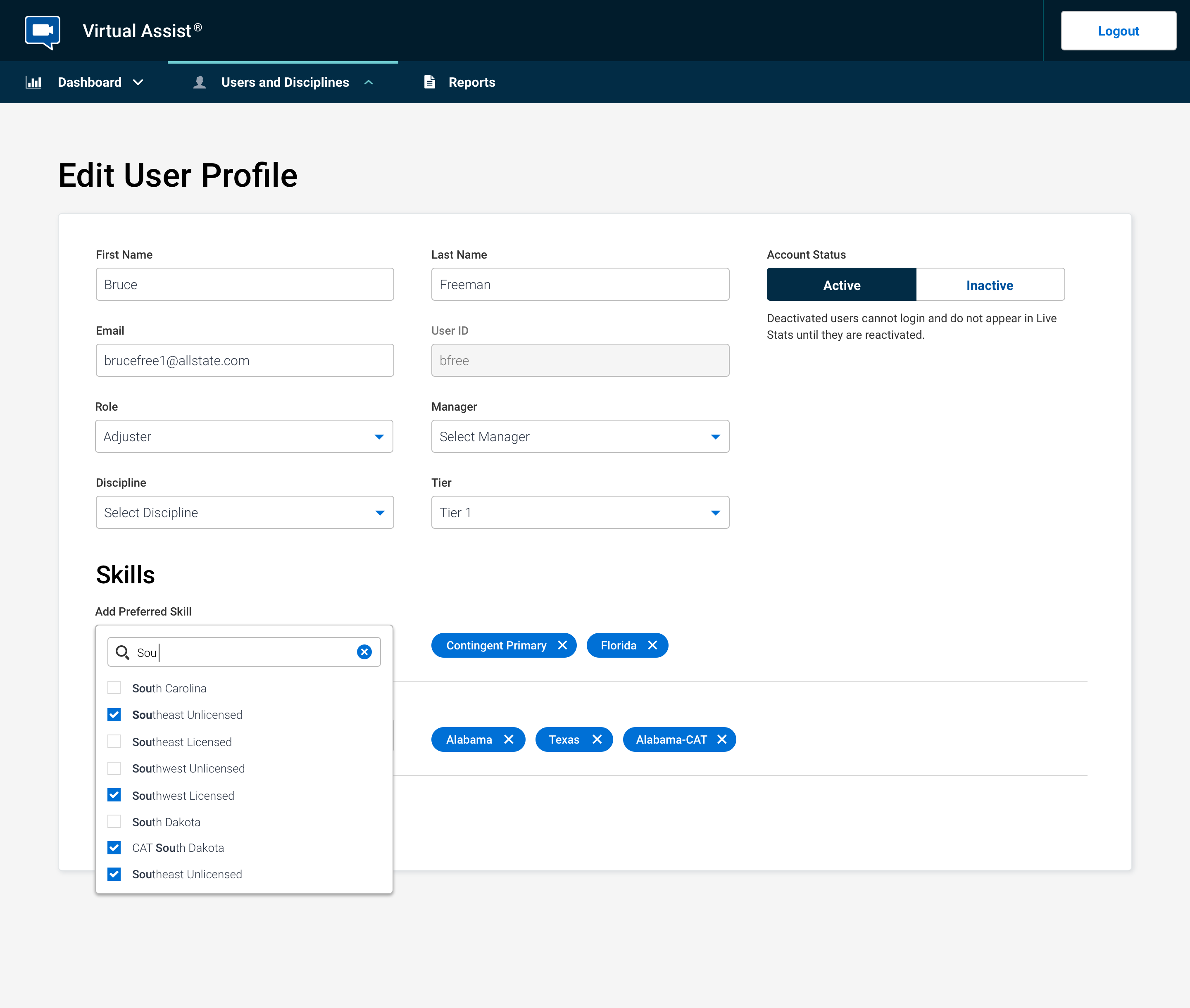 One of the big issues with this product was how calls were routed to internal and external claim adjusters and the tedium of making updates to dozens of adjusters' skills, one at a time, on a fairly regular basis. Work had to be done to create tiers of users, so video calls could be cascaded down from the front-line adjusters to the external adjusters when overflow occurs, as well as building two levels of skills to route property and auto calls to the right users. We also created the ability to add multiples of these skills to make the system even more flexible and cover as many use cases as possible.