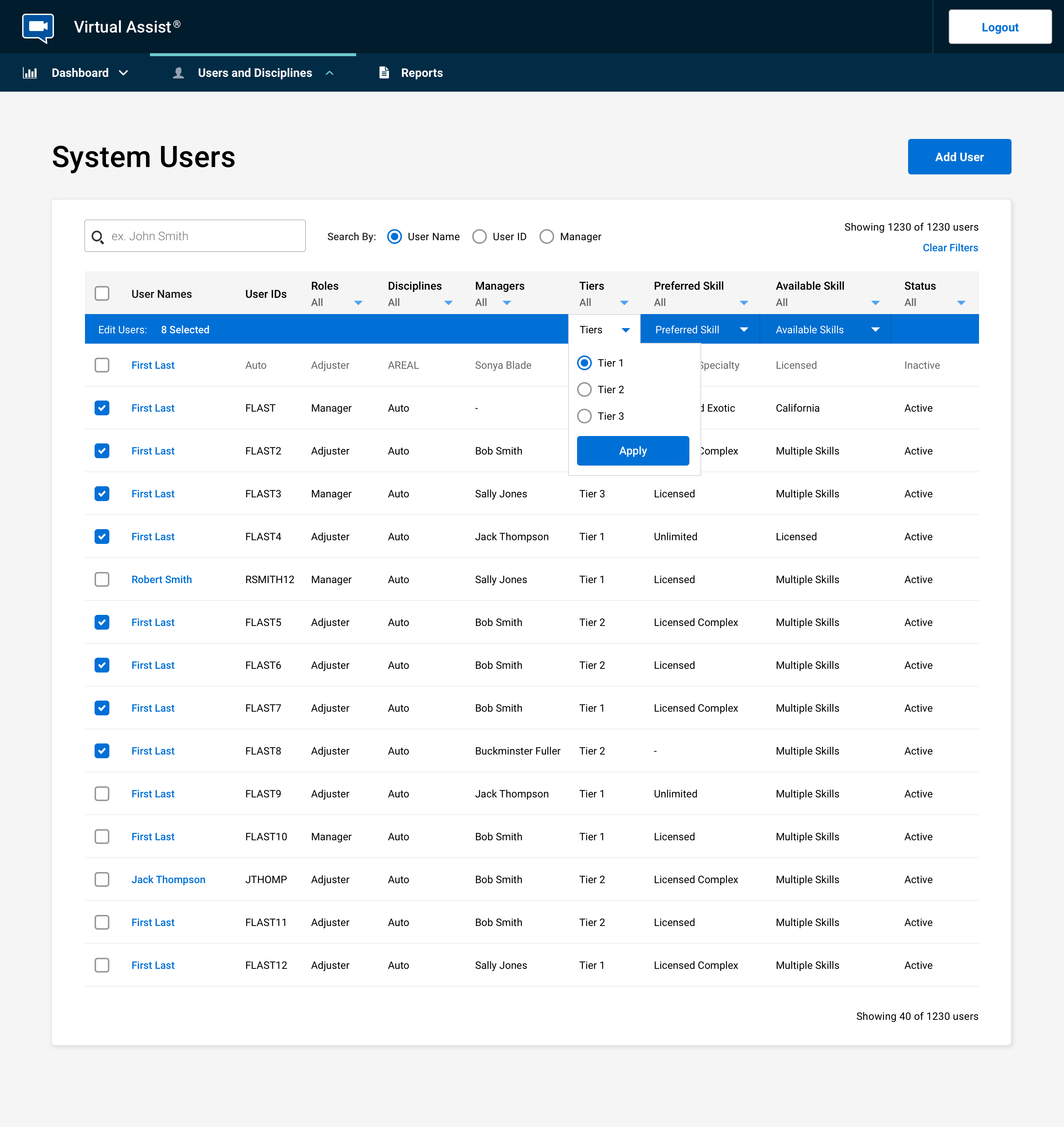 Another update to the admin app was adding the ability to multi-select and make batch changes to users. This helped the administrators shuffle resources around quickly and manage who would receive calls based on their tier, as well as primary and secondary skills.