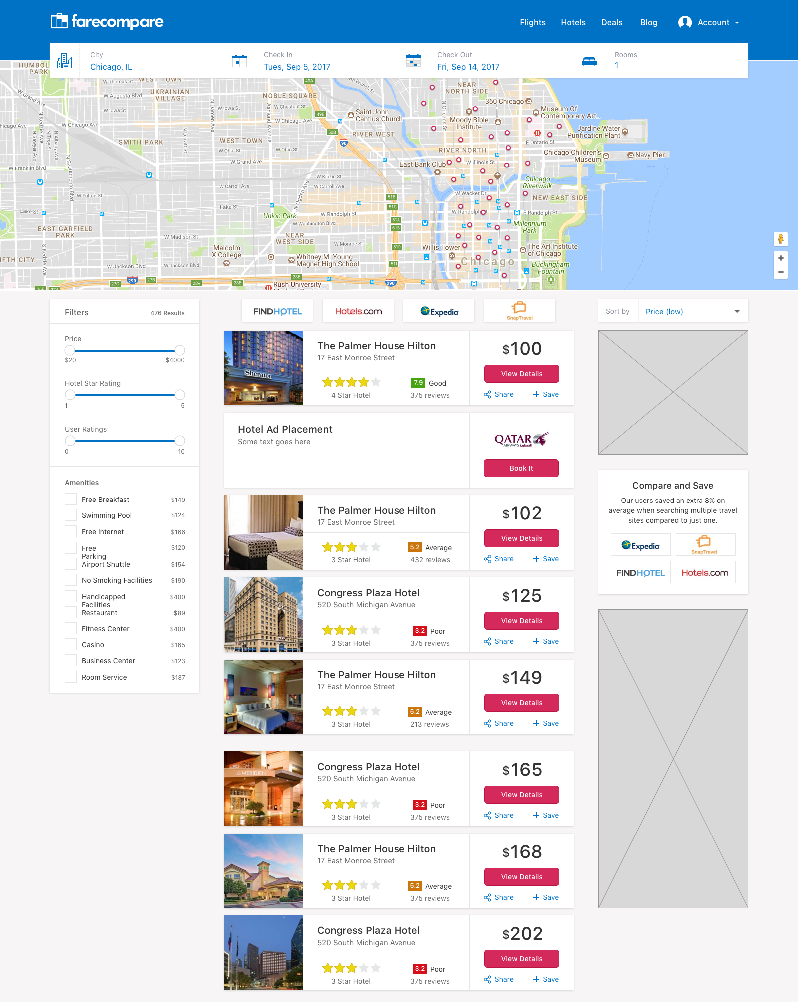 Hotel results used a similar layout to flights but incorporated a map because location is often key for travellers.
